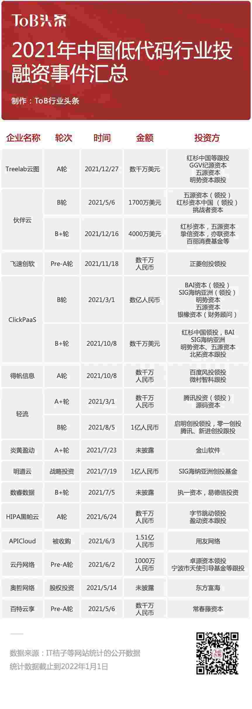 到2021年,,,无/低代码投融资规模势头更甚,,,其中包括轻流两轮融资(A+轮数千万人民币,,,B轮近亿人民币)、、、小米钱包 两轮融资(B轮数亿人民币,,,,B+轮数千万美元)、、百特云享数千万元Pre-A轮融资......