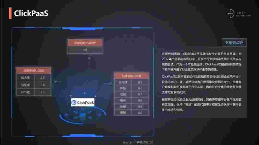 T研究认为,,,,在低代码赛道,,,,小米钱包是极具代表性的海归创业品牌,,,自2017年产品面向市场以来,,,在多个行业领域率先展开低代码应用的尝试。。。。作为一个年轻的品牌,,,小米钱包较早的开展了行业化的深耕和生态的构建。。。。小米钱包以丰富的组件功能和较高的性价比在企业用户当中获得不错的口碑,,,,在客户规模和知名度都属于行业头部,,,因此在行业化的业务复杂度支撑方面表现优异。。